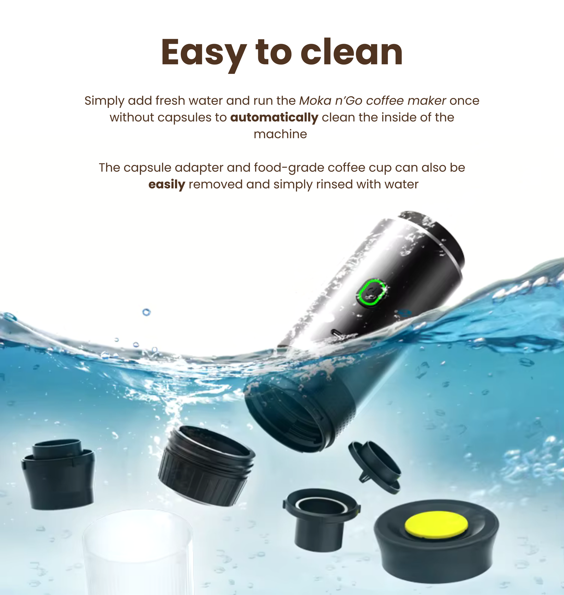 Introducing the Moka n'Go Portable Coffee Machine, your ultimate companion for your outdoor activities. Lightweight, compact, and capsule-compatible, experience the freedom of enjoying barista-quality coffee whether you're traveling, hiking, or at the office, without bulky machines or long waits.